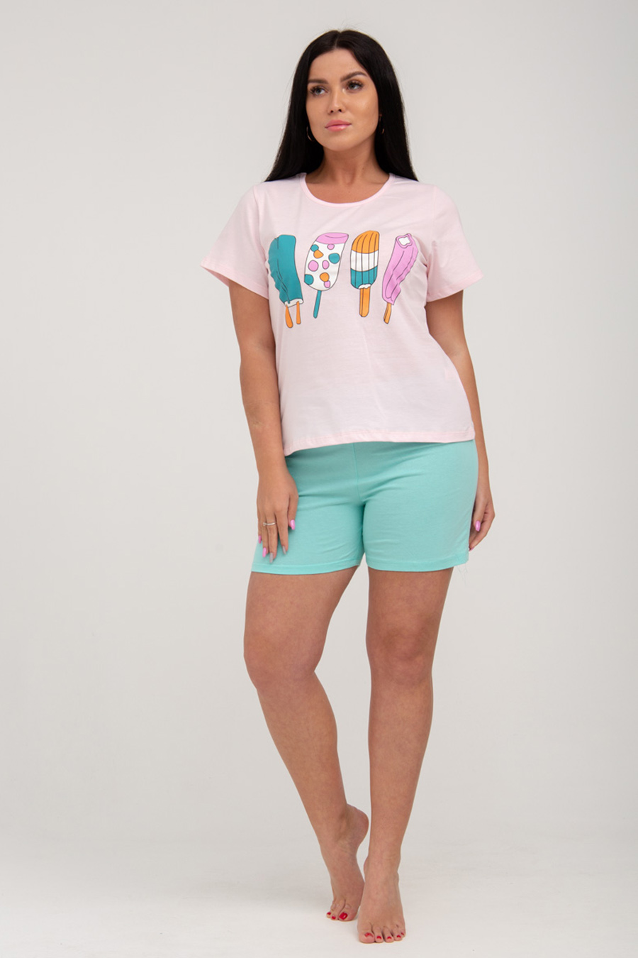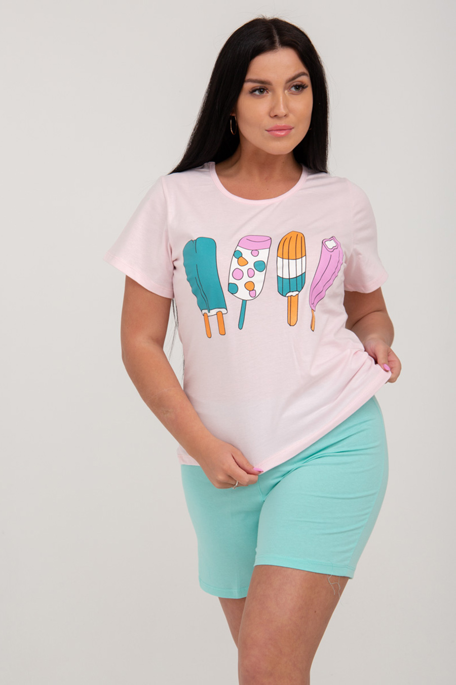 Домашний комплект ZARKA включает в себя футболку полуприлегающего кроя с короткими рукавами, округлой горловиной, и короткие шорты с карманами. Для более комфортной носки в пояс шорт вставлена широкая резинка. Варианты принтов комплекта в ассортименте.