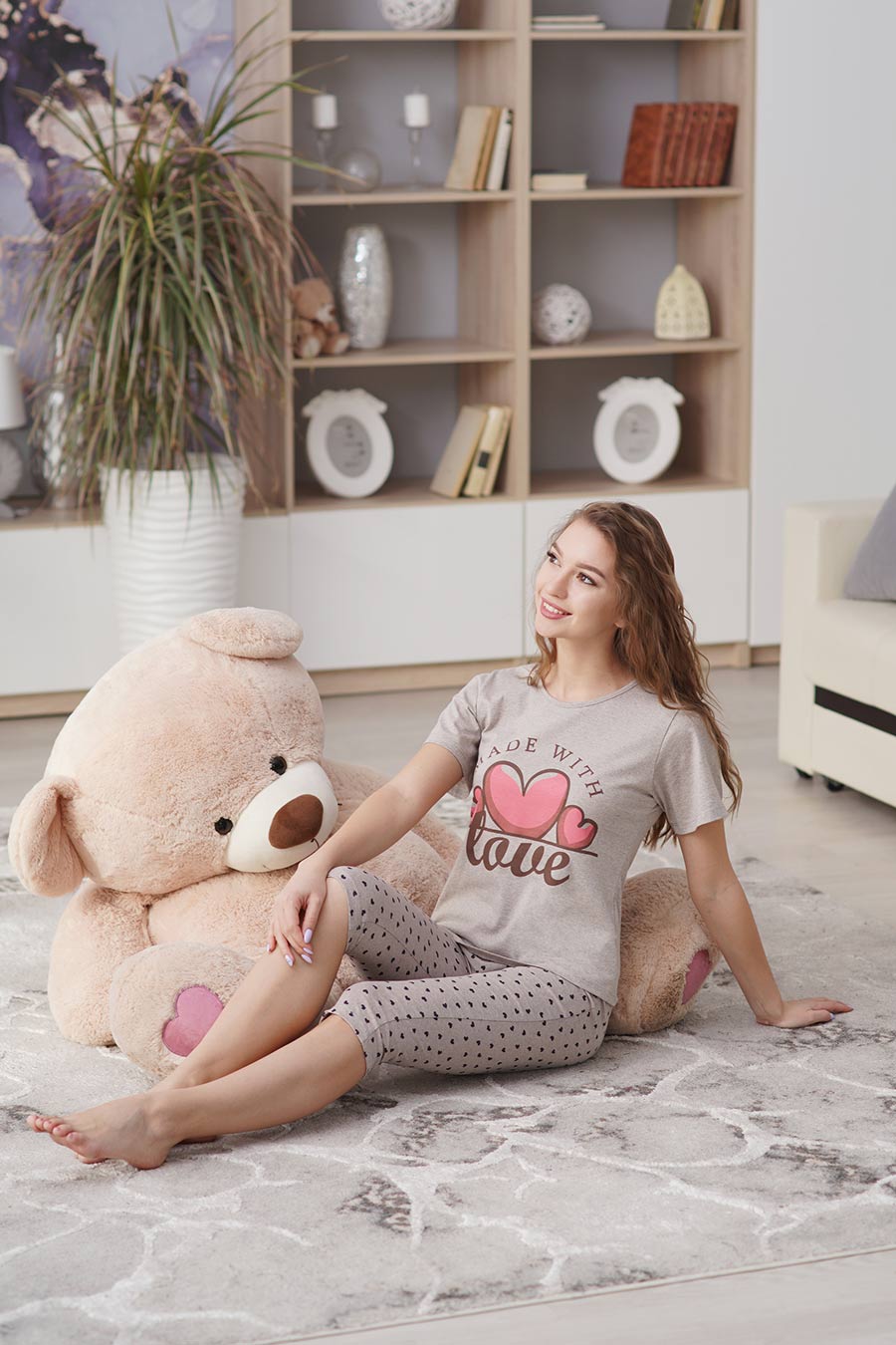 Милая и мягкая женская пижама от бренда ZARKA - это сама нежность! Почувствуйте, как приятно она "обнимает" вашу кожу, как удобно и легко в ней двигаться, бегать, убирать, готовить, танцевать, спать и просто радоваться жизни! Обворожительный принт бантики, сердечки поднимет вам настроение. В домашний костюм для женщин входят футболка и бриджи из качественного материала, который наполовину состоит из хлопка. Поэтому пижама очень приятная на ощупь, отлично впитывает влагу, при этом тянется, почти не мнется и прекрасно сохранит форму и цвет даже после многочисленных стирок. Встречайте лето в удобной и практичной одежде, надевайте стильный комплект для дома на дачу, прогулку на природе и занятий спортом на свежем воздухе. В наличии есть также и большие размеры, поэтому пижама будет очень удобной для беременных и кормящих мам, ведь ее можно взять с собой в роддом. Отличный подарок для девушек и женщин, которые ценят комфорт и качество. Удачных покупок! Характеристики