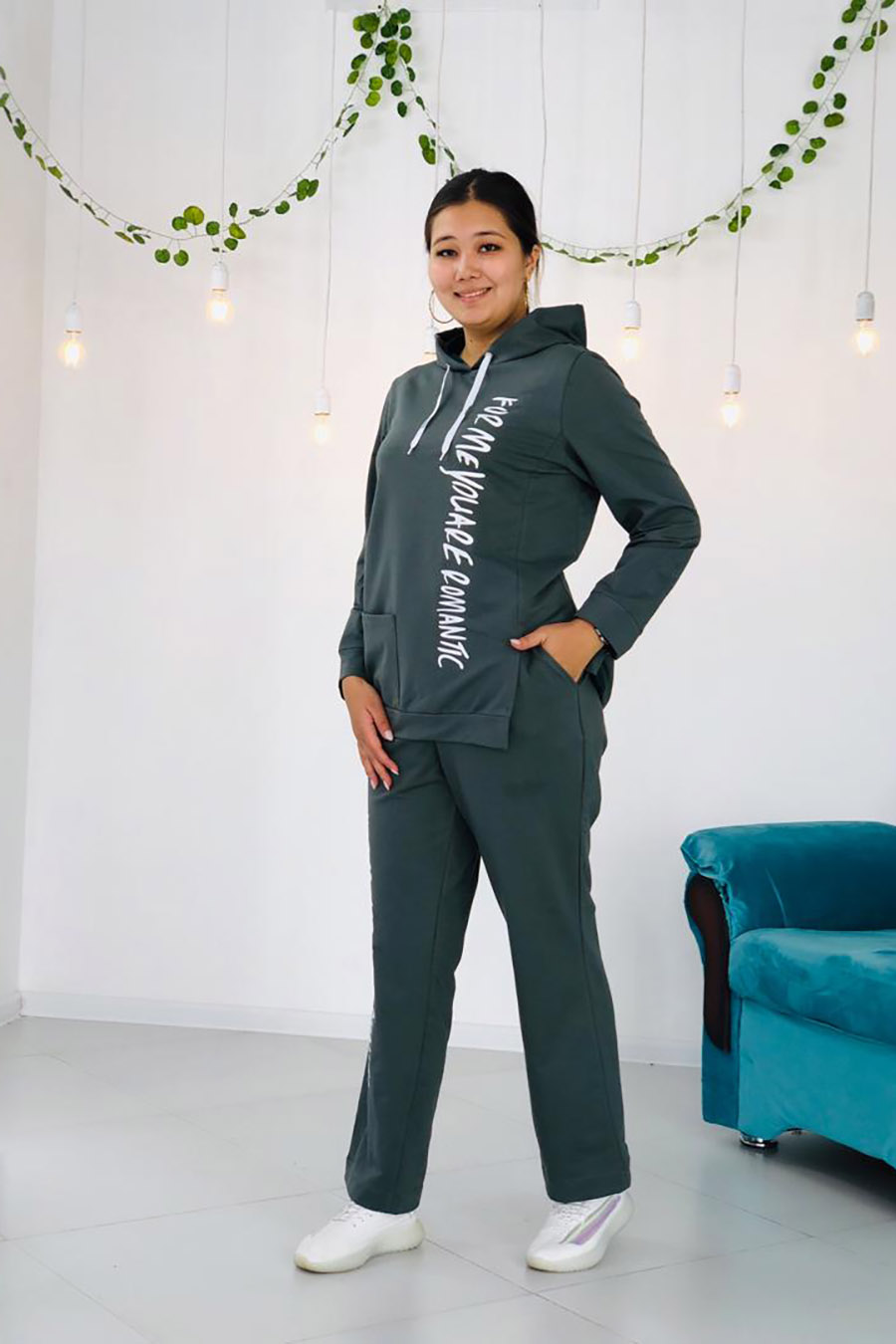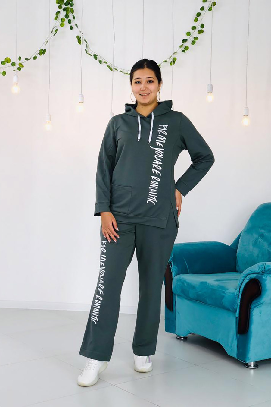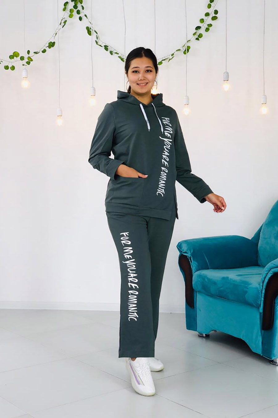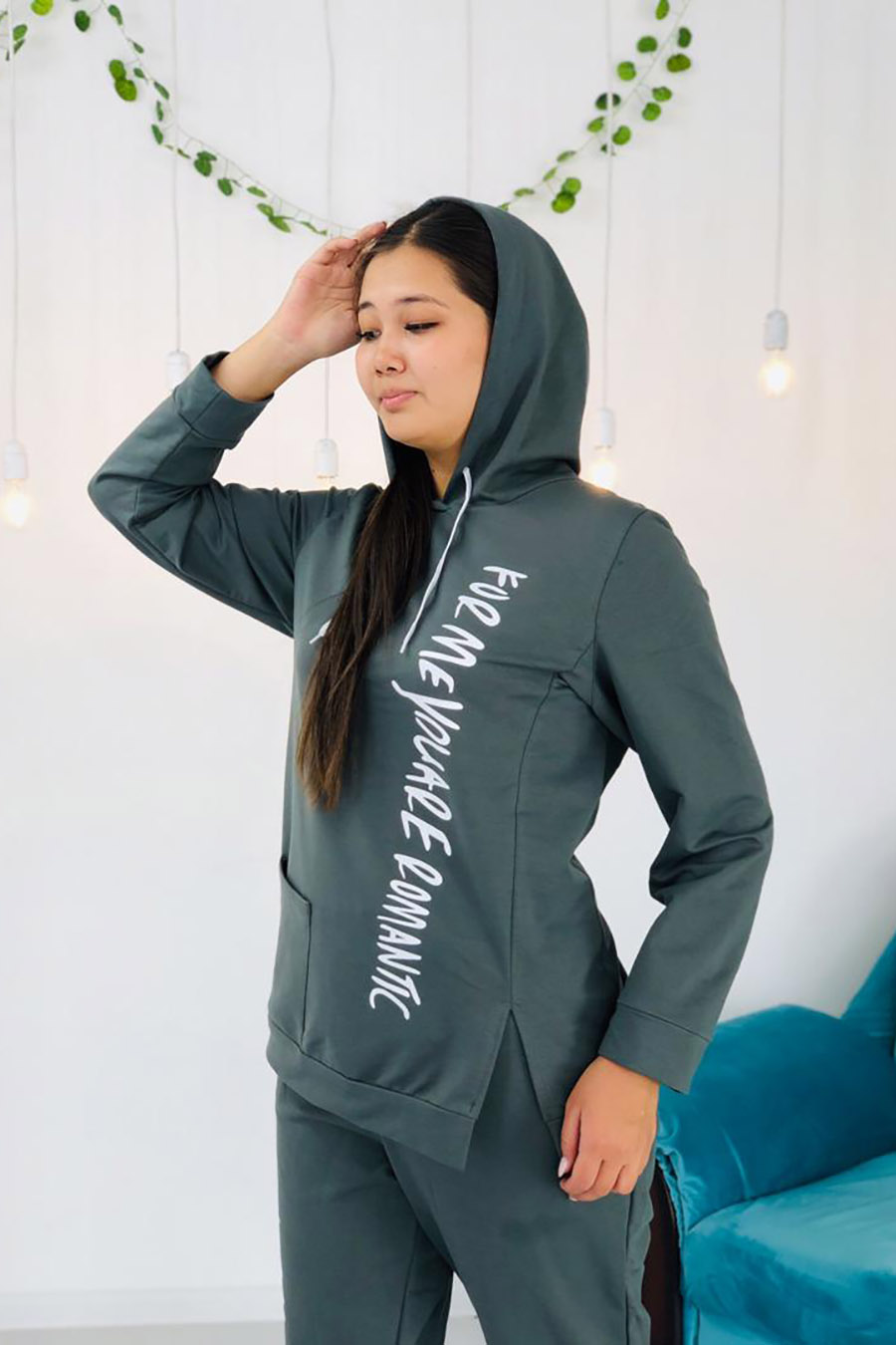 Женский спортивный костюм с худи и штанами. Худи однотонное с длинным рукавом и капюшоном. С текстовым вертикальным принтом сбоку, накладным карманом и разрезом. Штаны длинные свободного кроя с текстовым вертикальным принтом. Минималистичный спортивный костюм не сковывает движения и подходит не только для спорта, но и для повседневной носки. Характеристики
