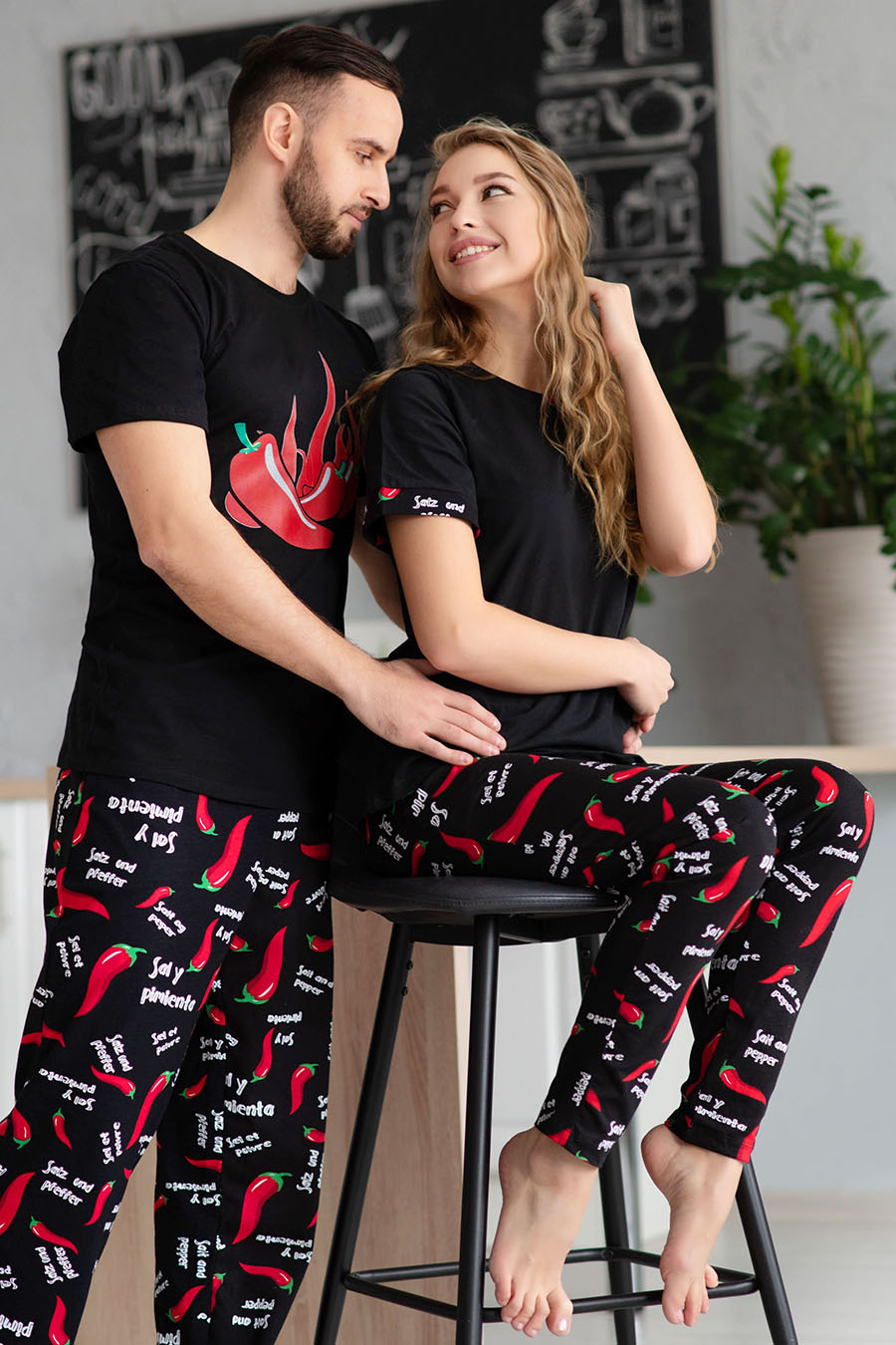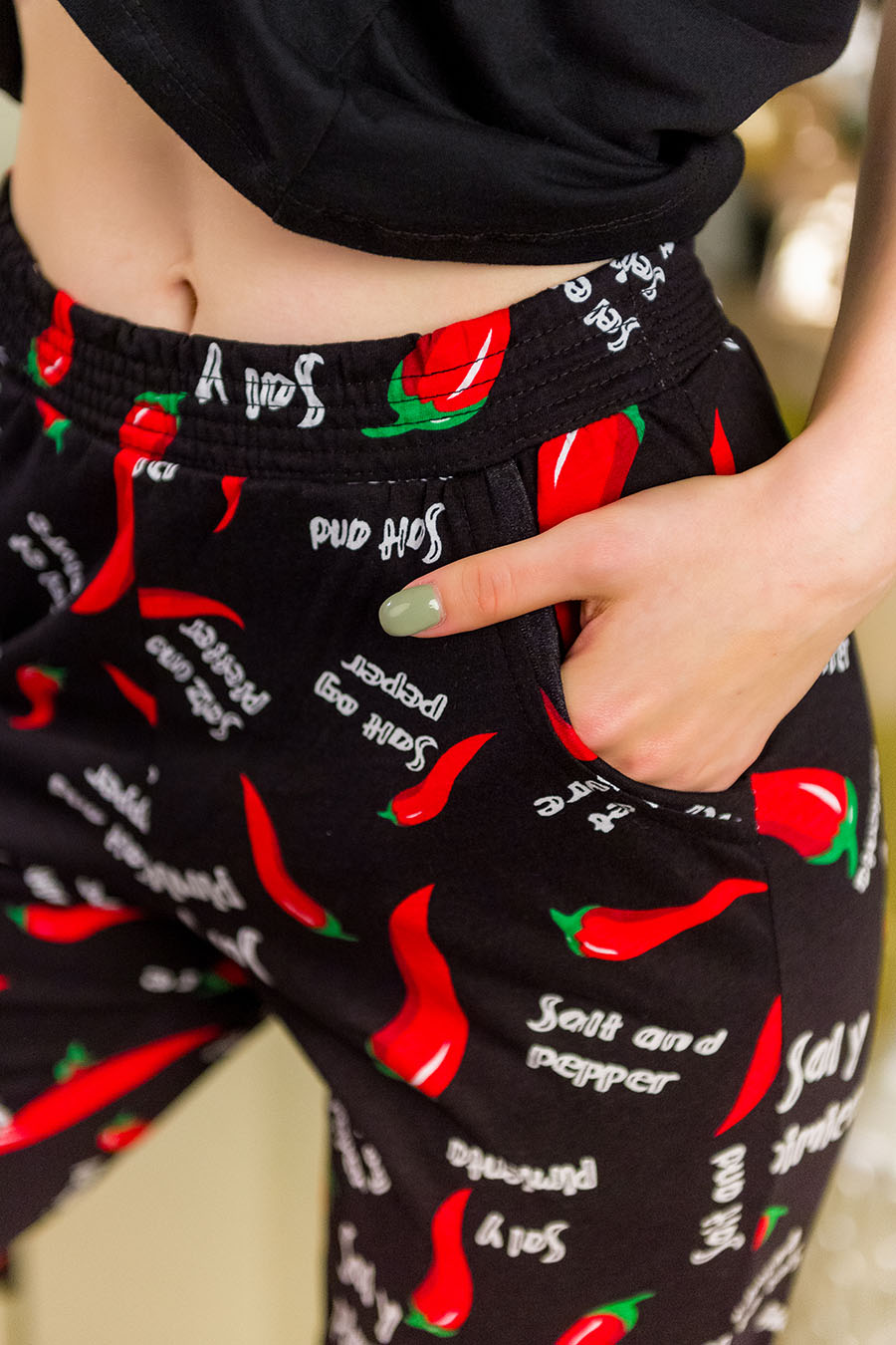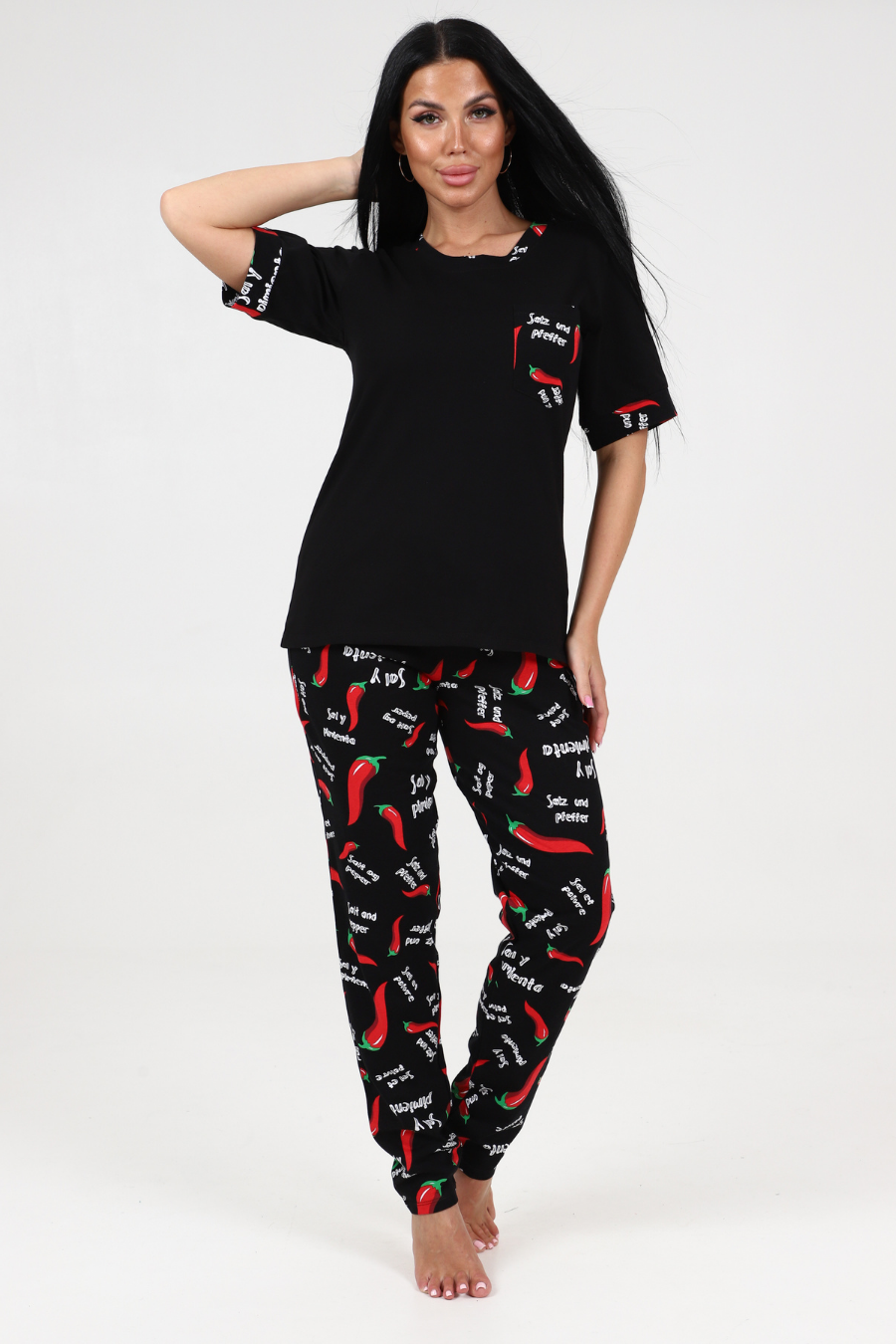 Легкая и приятная к телу пижама - залог прекрасного отдыха и комфортного сна. Уютная одежда для дома включает в себя футболку и брюки. В пояс штанов вставлена широкая мягкая резинка, карманы с отрезным бочком. Яркий принт на брюках "Перец Чили с надписями". Футболка с коротким рукавом, округлой горловиной и нагрудным карманом. Окантовка по горловине, рукавам и карман выполнены из контрастной ткани в тон штанов. Костюм можно использовать не только как пижаму, но и в качестве одежды для дома. Домашний костюм состоит из 100% хлопка. Благодаря такому составу достигается высокий уровень прочности и износостойкости изделия. Главным достоинством пижам ZARKA является их гипоаллергенность и экологичность. Многократные стирки, глажки домашняя одежда для женщин переносит хорошо, не теряя при этом своих характеристик. Размерная сетка включает большие размеры. Подойдет женщинам и девушкам с любым типом фигуры, в том числе беременным и будущим мамам. Сделайте подарок себе и своим близким! Характеристики