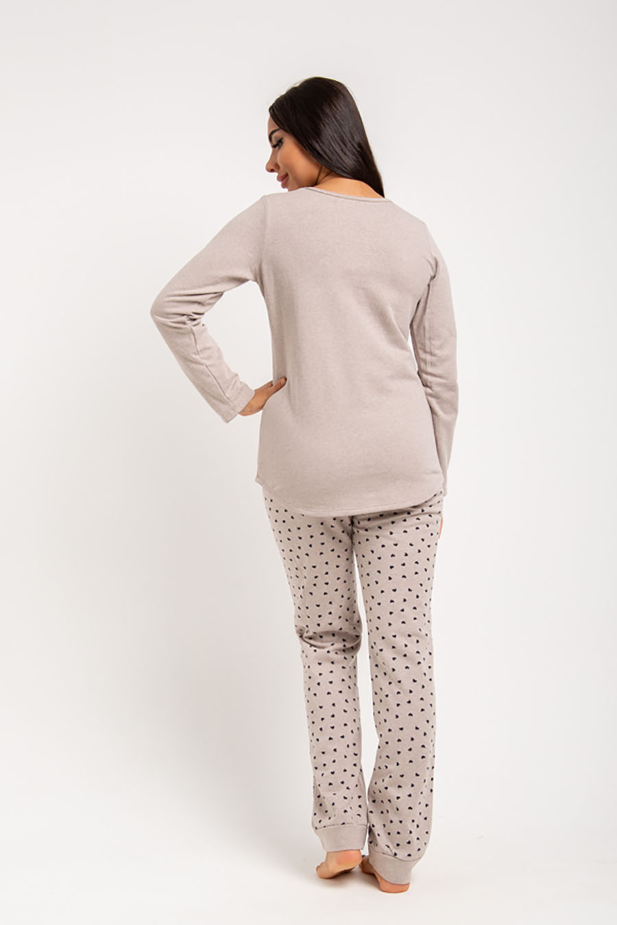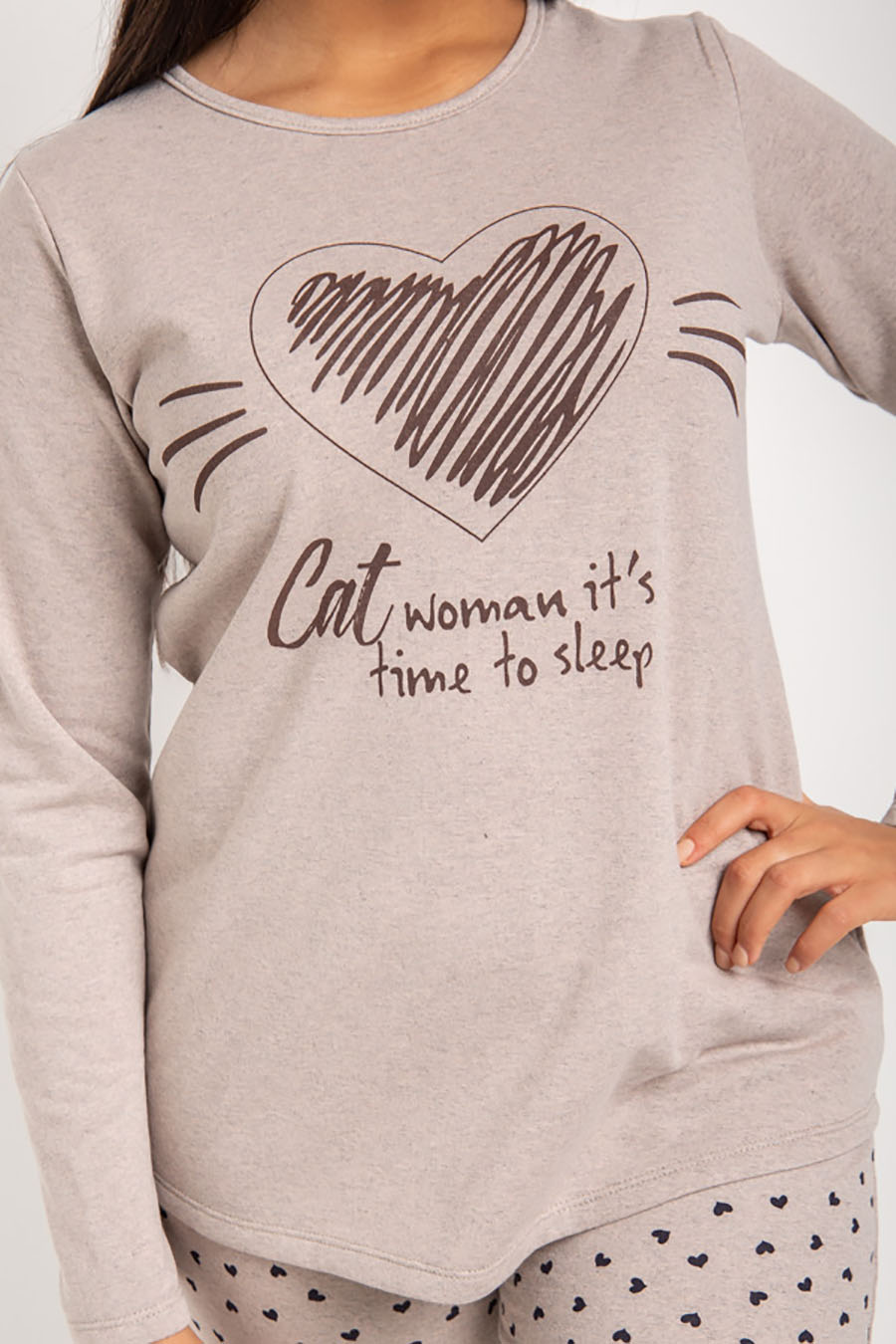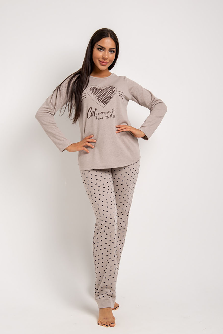 Мягкая, уютная женская пижама выпускается в тёплых, спокойных тонах различной расцветки, которые способствуют ощущению расслабленности и уюта. Красивый и современный кошачий принт с подписью и сердечки придают образу дополнительной стильности, подойдут как для подростков, так и для девушек. Удобный крой и эластичная брючная резинка обеспечивают свободу движений для ежедневного ношения.Утепленная пижама из ткани-футера согреет не хуже шерсти благодаря легкому изнаночному начесу. Снаружи одежда для дома гладка и приятна на ощупь. Качественный домашний костюм с полуприлегающим покроем оттягивает лишнюю влагу, не раздражает кожу, предполагает большие размеры, поэтому это - отличный подарок беременным.Футер с начесом более прочен и износостоек за счет полиэстера. Пропорция хлопка и полиэстера считается одной из самых оптимальных, поэтому пижама для женщин способна обеспечить комфортный сон.Брюки и лонгслив хорошо сохраняют форму, не растягиваются - даже после многих циклов стирки. Характеристики