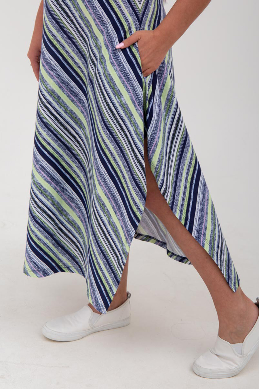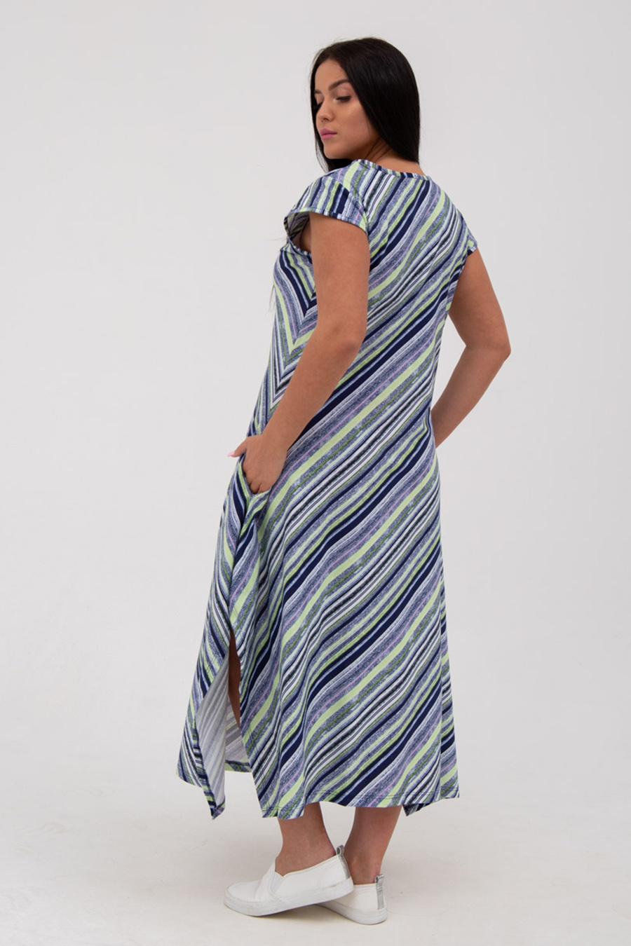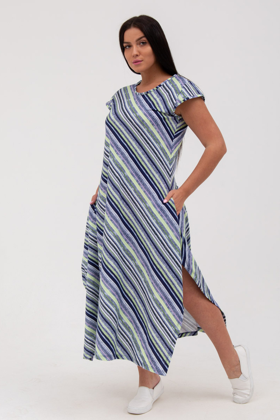 Платье в шикарную диогональную, разноцветную полоску. Сокруглой горловиной, свободного покроя, с"Т"-образным расширением от бедер и карманами в боковых швах. Длина миди. Рукав крыло. На фигуре приобретает вид трапеции,что позволяет отнести, к такому популярному сейчас стилю бохо. Легкое и прохладное. Прекрасно корректирует фигуру и отлично смотрится в любых размерах. Характеристики