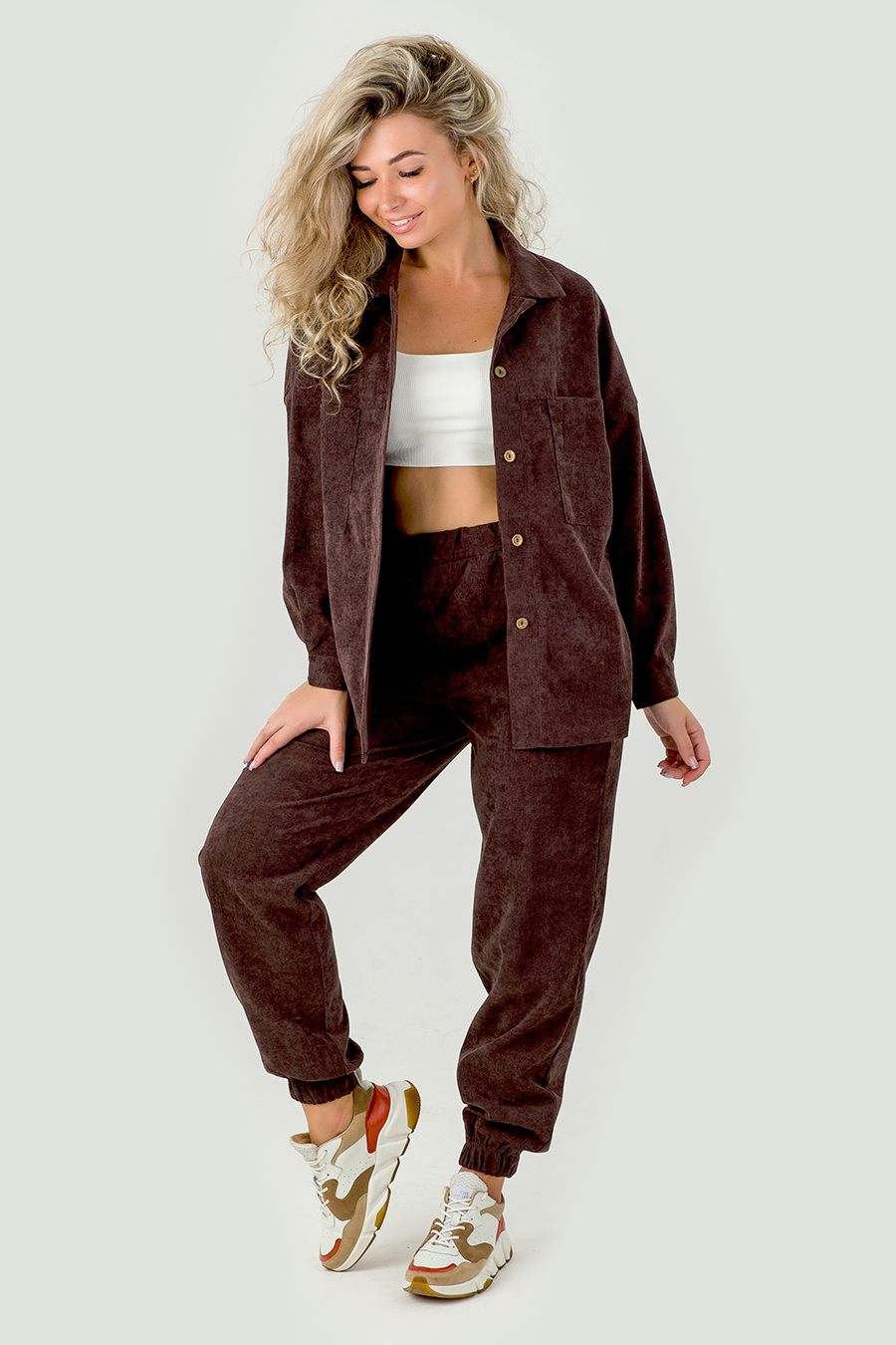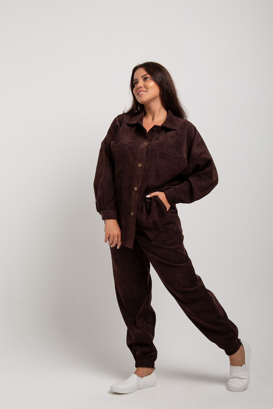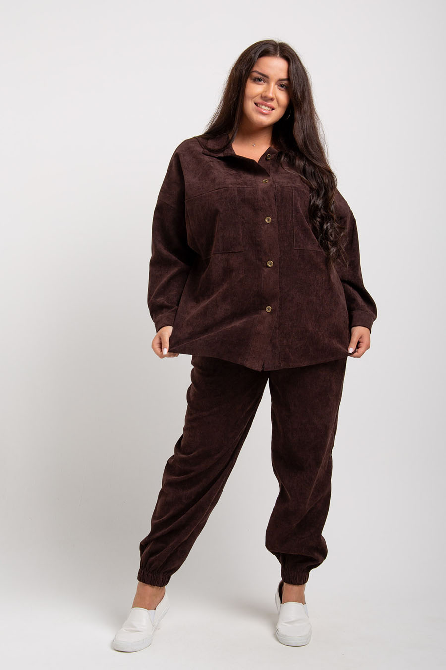 Женский костюм из микровельвета будет уместно смотреться как в рабочей обстановке, так и во время отдыха на природе, даче или дома. В комплект входят рубашка свободного кроя с отложным воротничком на пуговицах штаны-джоггеры с 2 прорезными карманами.