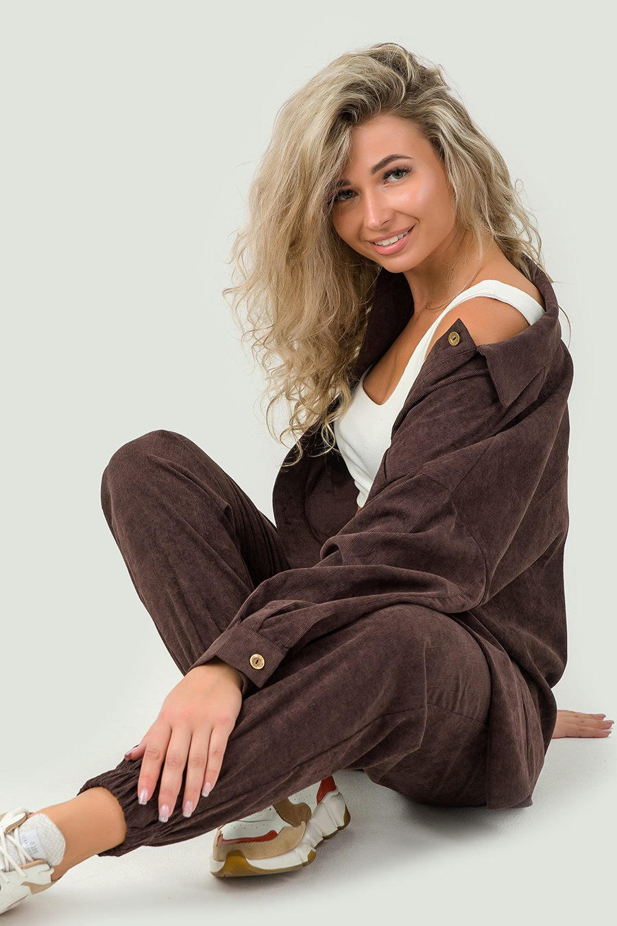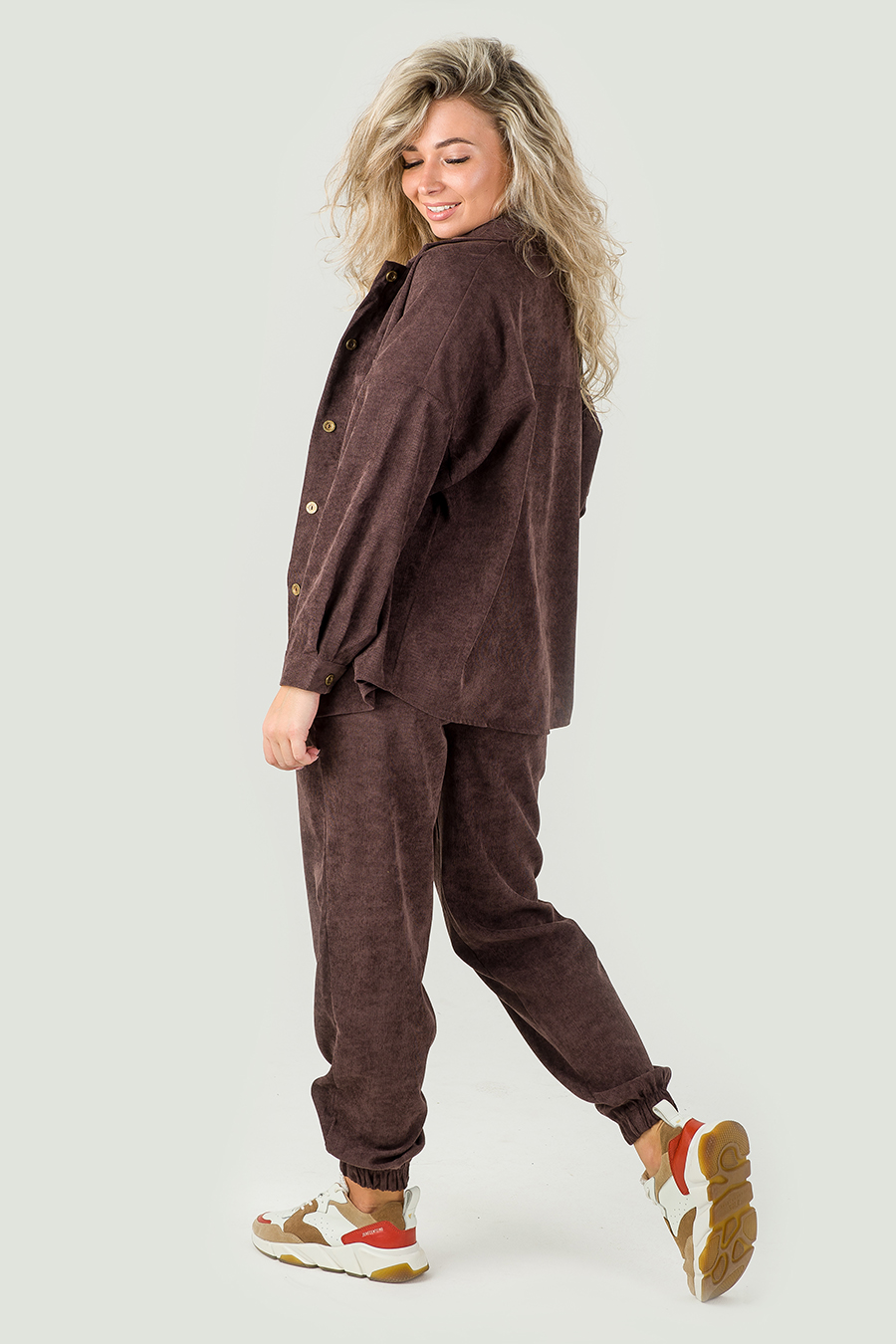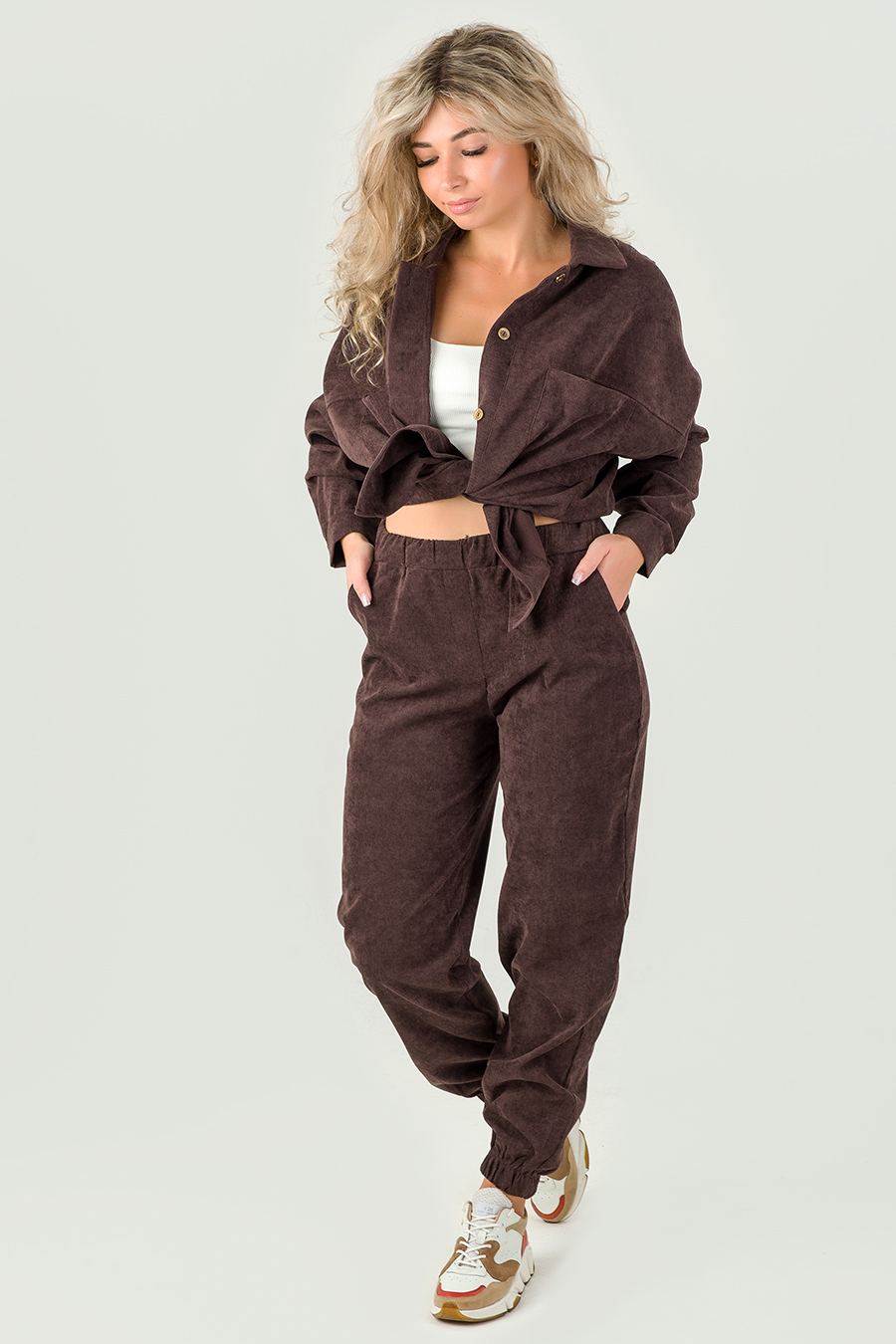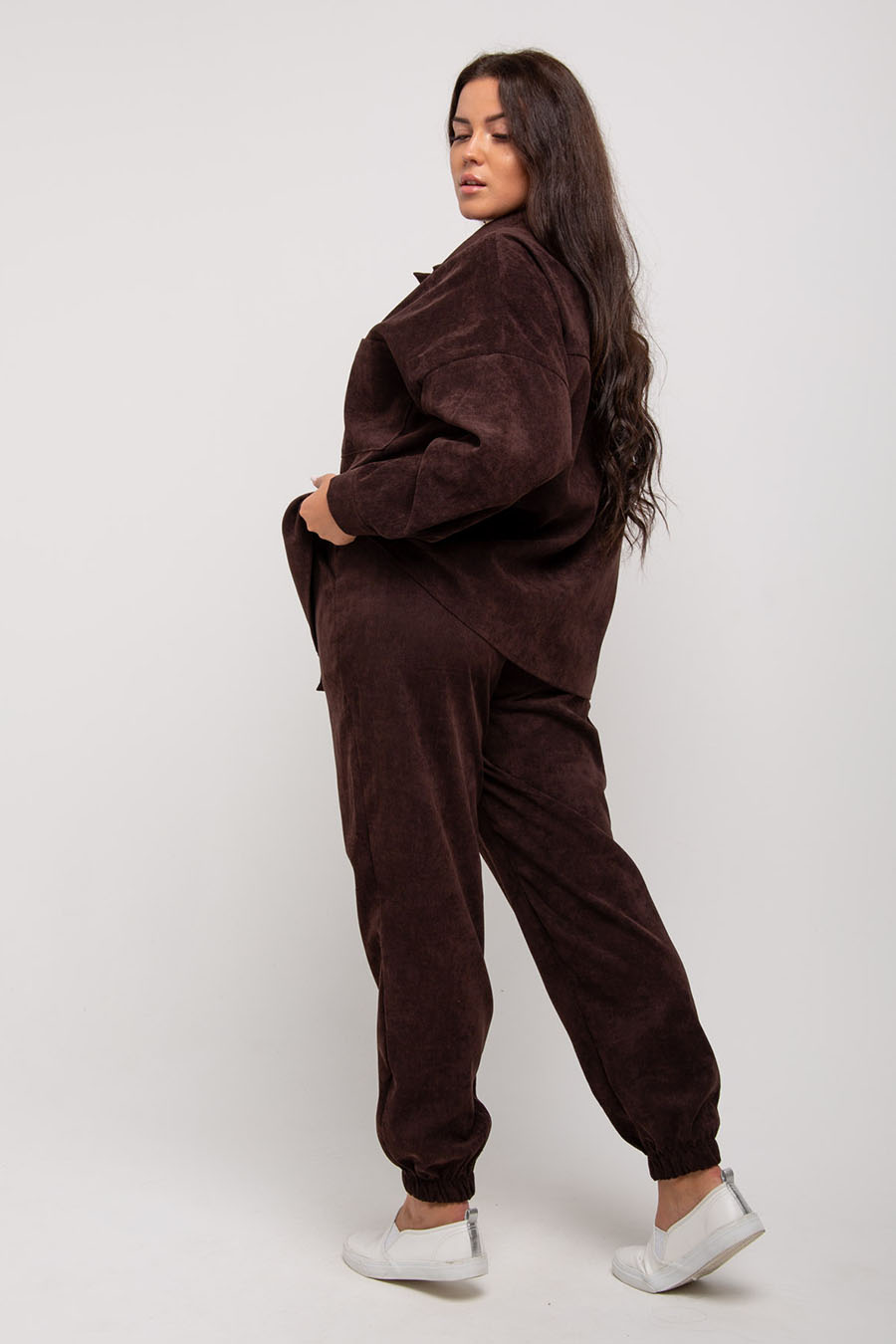 Женский костюм из микровельвета будет уместно смотреться как в рабочей обстановке, так и во время отдыха на природе, даче или дома. В комплект входят рубашка свободного кроя с отложным воротничком на пуговицах штаны-джоггеры с 2 прорезными карманами.